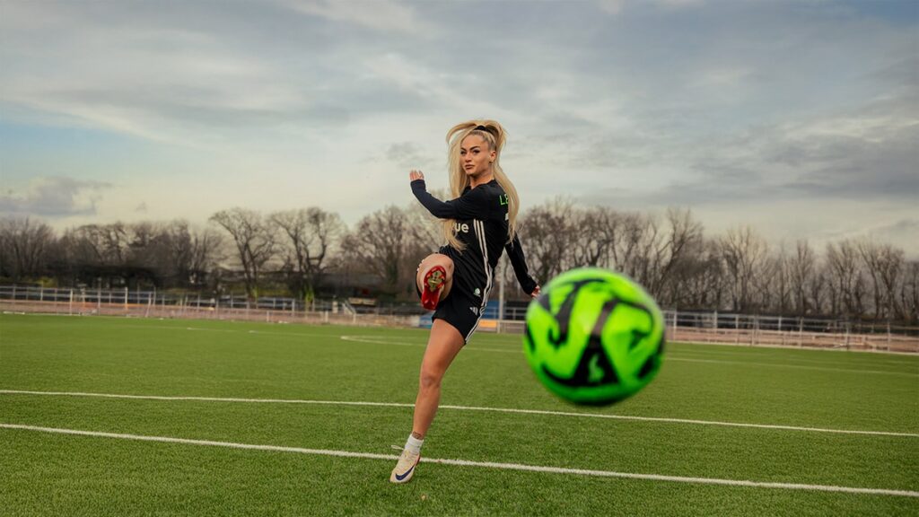 Her page is loaded with exclusive stuff: pro photoshoots in stylish, confident outfits (classy, no nudes), face-covered poses, training and recovery clips, everyday moments fans rarely see, and football nostalgia — including the viral Ronaldinho crossbar challenge she did for the launch (the one where the ball accidentally nailed the cameraman…a classic).